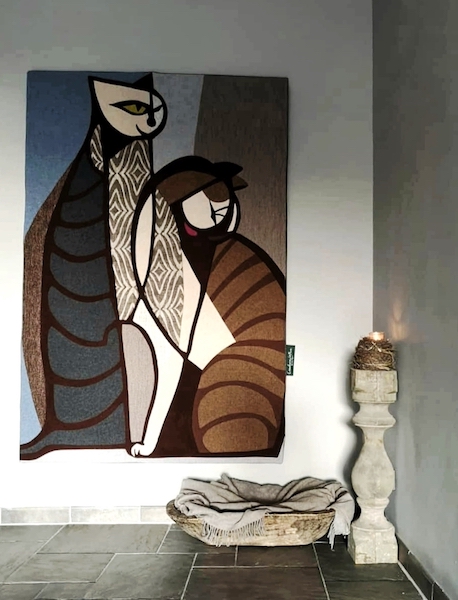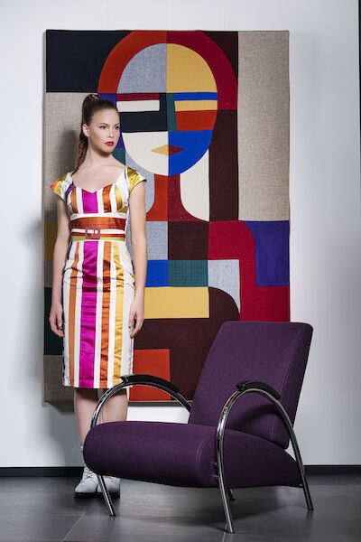 Deze richting naast mijn werk als kostuumontwerpster heb ik “CouturedeMur” genoemd. In deze handgemaakte “kostuums” werk ik uitsluitend met interieurstoffen, veelal met wol in diverse kleuren en dessins. De uitdaging en de kunst om deze te verwerken in een blikvanger in het interieur, is in deze vorm van wanddecoratie zeker ook een uiting waarin ik alle liefde en passie voor mijn vak kwijt kan.